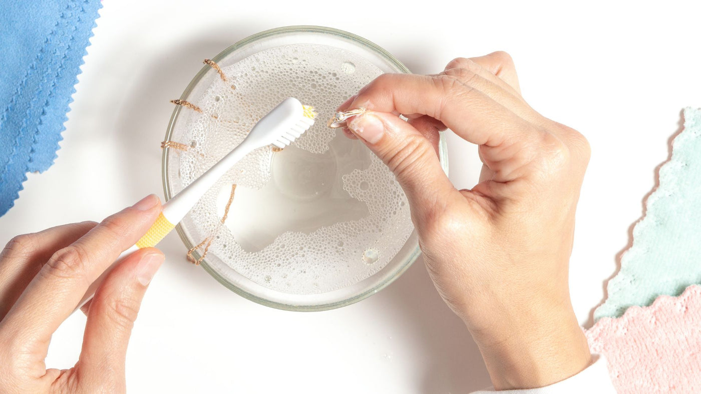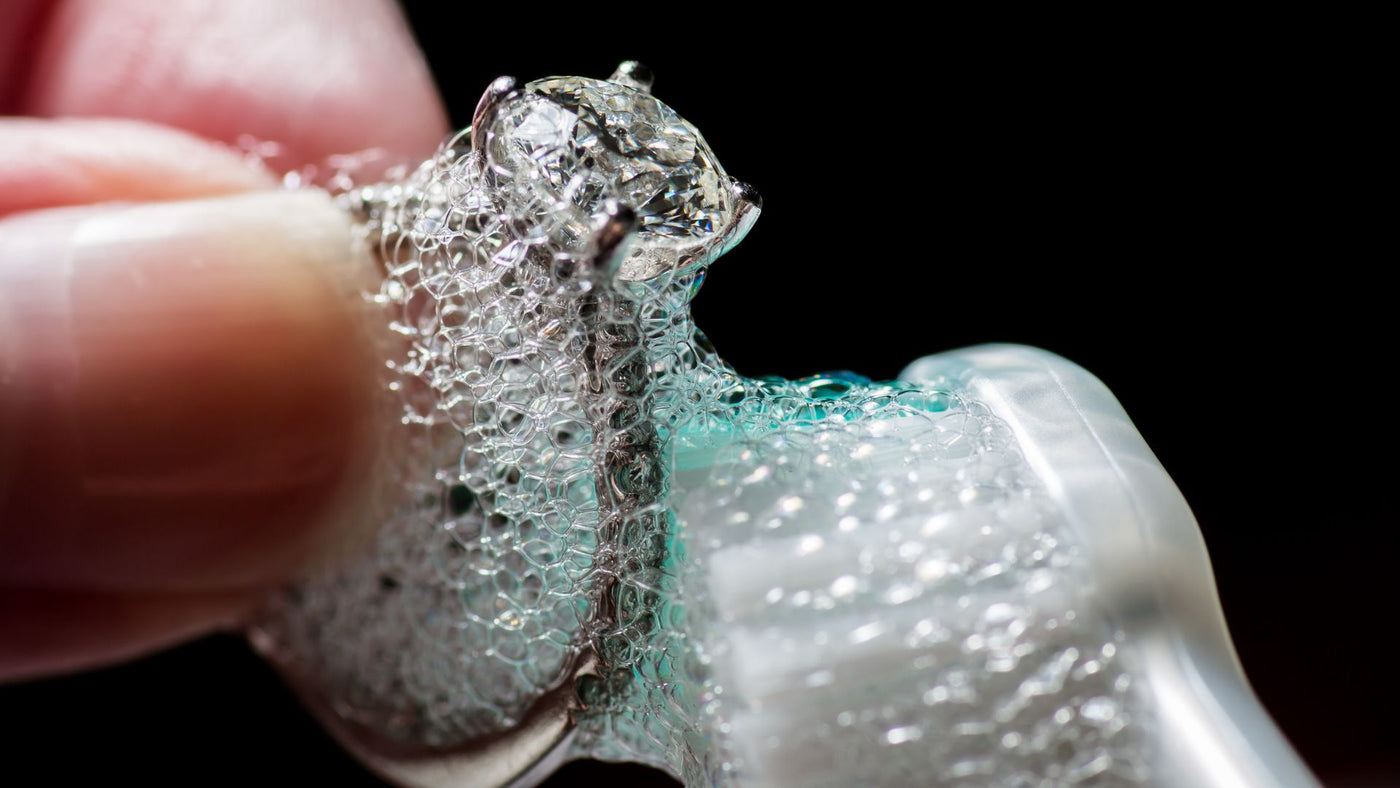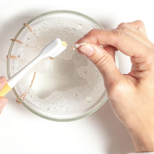 Natürlich sollten Sie jedes Mal, wenn Sie Ihren Schmuck in der Nähe einer Wasserquelle reinigen, den Abfluss schließen, bevor Sie beginnen. Eine kleine Schale oder ein Behälter ist ebenfalls eine gute Idee, um Ihre Diamanten einzuweichen und zu waschen.