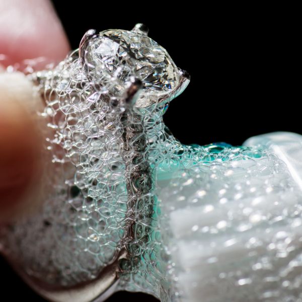 Es ist zu beachten, dass Diamanten nicht völlig unzerstörbar sind. Einige Reinigungslösungen, insbesondere die Reinigung mit Ultraschall, können ein gewisses Risiko darstellen. Scheuernde Reinigungsmittel und Chemikalien können ebenfalls zu Abplatzungen und Splittern führen. Vertrauen Sie auch nicht den "magischen Reinigungslösungen", die online verkauft werden.